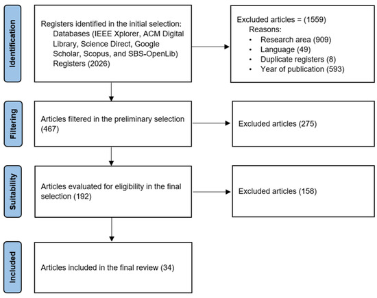 Therefore, the results point out the categorizations for the works selected by the systematic review process. Of the total of 2026 articles returned from the databases, applying the exclusion criteria, 467 were selected in the initial selection phase. In the preliminary selection phase, filters were applied by reading the titles, abstracts, introductions, and conclusions of the articles, and 192 articles were selected. Finally, in the final selection phase, based on the inclusion criteria, 34 articles were accepted in total, 27 in English and 7 in Portuguese.