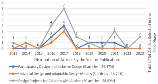 Through the selection process of this SLR, the articles extracted from the databases were divided into three categories according to the keywords “participatory design and inclusive design”, “universal design and adaptable design models”, and “design projects for children with autism”. It is worth mentioning that grouping through keywords is a way of answering the research questions (RQ1, RQ2, and RQ3). These categories are presented in Figure 2.