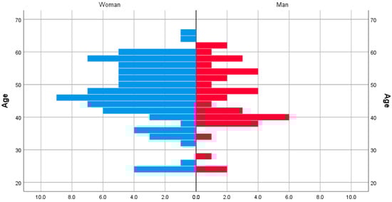 In total, 118 educators from 43 higher education institutions participated, of which 67.80% were women and 32.20% were men. The mean age was 46.16 years (SD = 9.60), with the minimum age being 24 and the maximum being 65. Figure 1 reflects the distribution of this sample, taking into account gender and age in a population pyramid.