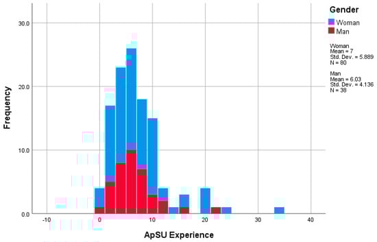 Regarding the academic level of the participants, a large majority (76.3%) had a doctoral degree, while the rest had at least a bachelor’s degree. Regarding their experience in using service-learning, the average was 6.69 years (DT = 5.39), with a half-year at the lowest and 34 years at the highest. In Figure 2, this distribution can also be observed according to gender.