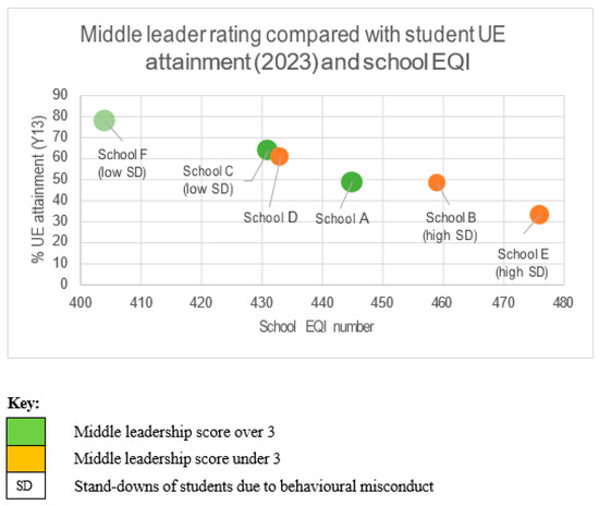 Figure 1 provides an illustration of the percentage of students who gained UE in each of the participant schools compared to the overall socio-economic status of students in the school (EQI) and the middle leadership score (shown by bubble size and colour) calculated in Table 2. Furthermore, schools that had over 50% fewer stand-downs of students or over 50% more stand-downs, when compared to the national average, have been noted on the graph. The school with the highest UE pass rate (F) is a single-sex girls’ school situated in a large middle-class urban area of a city. It has a high middle leadership practices rating (3.47), with very little disagreement between middle leaders and teachers about the enacted and experienced practices. School F also had the lowest stand-down instances of the sample (79% below the national average). The data show School F as having the highest UE entrance rate for students in the sample and the lowest number of students from low socio-economic backgrounds. Conversely, the co-ed school (E), situated in a lower socio-economic area of a large urban city, has the lowest percentage of students who gained UE in the sample and also the highest instances of stand-downs (154% above the E (2.94)), which indicates an inconsistent level of effectiveness by respondents. The data reveal a large variance in stand-down instances in secondary schools and highlight the vastly different contexts in which New Zealand middle leaders teach and lead. Stand-down data provide an indication of the schools where student engagement in learning may be low [49] and where middle leaders and teachers may have greater responsibilities with regard to student discipline. The New Zealand Education Review Office recently released a report on the significant behavioural challenges teachers face in schools [53]. The report highlights the burden of behavioural misconduct on teachers and school leaders, with 47% of teachers reporting that responding to challenging behaviour impacts their ability to teach and 60% of school leaders noting a lack of time to deal with behavioural issues [53].