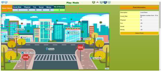49]. Consider a ChoiCo user in the role of the player, ‘Tina’. The game is called ‘COVID Survival’ and can be found amongst other example games on the ChoiCo site for anyone to play or make changes to. In ‘COVID Survival, Tina as the player is a citizen, and she lives in the COVID pandemic era. The choices available to her are about everyday activities such as ‘running’, ‘going to the mall’, ‘resting at the park’, etc. For instance, she can consider ‘walking with a friend’. If she does choose to do this, the game tells her what the consequences will be along a line of values. The values are ‘physical capacity’, ‘it’s fun’, ‘social’, ‘money’, and ‘risk of COVID infection’. So, the game tells Tina what is going to happen if she makes a choice before she decides to make it. If she chooses to take a walk with a friend, then the COVID risk would be a random number from minus five to minus fifteen, i.e., an equal probability in the respective range of values. So, there would be some risk of catching COVID, i.e., being thrown out of the game, but not a lot. In any case Tina would not be certain of what is going to happen. Her ‘physical condition’ would in this case improve by 20 points (points are arbitrary of course). Fun, social activities have positive consequences, and money has slightly negative consequences, since they might hypothetically go to a vending machine. So, upon clicking on the selection of the choice to walk with a friend, Tina observes the change in aggregate values in a respective panel on the screen. Then, she can try doing something else, considering how to manage the negative consequences of her previous choice. If she decides to go to the local store or the shopping mall, then she will greatly benefit in fun, social, and physical condition but she would be in grave danger of catching COVID and will get into financial trouble (