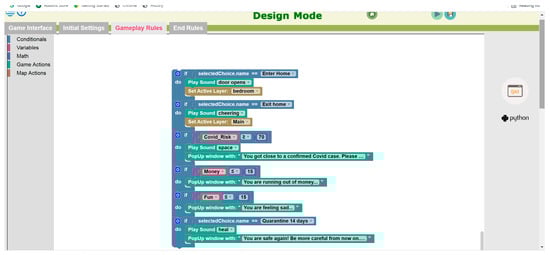 49], we analyzed their progressive process of exploration (play the game), deconstruction (break down the game structure), analysis (analyze the game elements), synthesis, and construction. The process involved the integration of interacting with various affordances (graphics, story, rules, characters, etc.) and with the use and understanding of Blockly programming concepts such as conditionals, Boolean logic, and event handling, but also programming processes such as developing high thinking skills like iteration and refinement, debugging, error prediction, etc. [