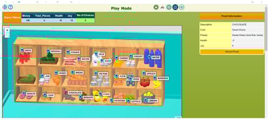 http://etl.ppp.uoa.gr/choico (accessed on 6 June 2024). A smaller number of these have been designed for more focus on mathematical ideas. So far these have been embedded in permutations of a specific gaming idea, which is shopping in a supermarket. Supermarket games have gained wide-scale visibility since they reside in the official recourse portal of the Ministry of Education in Greece (