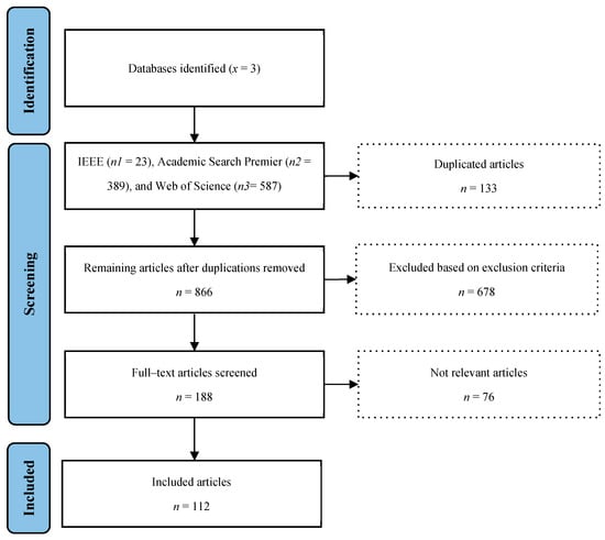 We utilized a comprehensive set of keywords to systematically search for the relevant literature in three major databases: Academic Search Premier, Web of Science, and IEEE. The keywords used in our search strategy are presented in Table 1.
