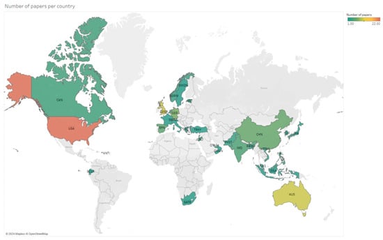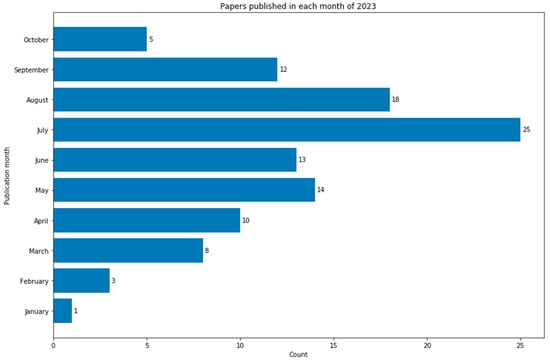 Figure 3 displays the number of included articles per publication month in 2023 (hereafter, when we talk about our results in 2023, we mean the results we found up till 12 October 2023). The highest numbers of papers were published in July (n = 25) and August (n = 18), while the lowest numbers of papers were published in February (n = 3) and January (n = 1). This trend suggests a growing academic interest in the field, potentially influenced by academic calendars, grant cycles, or conferences. The data also indicate that the start and end of the year had less research output, which reflects the planning and development phase of research activities. Furthermore, the database search was conducted on 12 October 2023; therefore, no data were available for November or December.