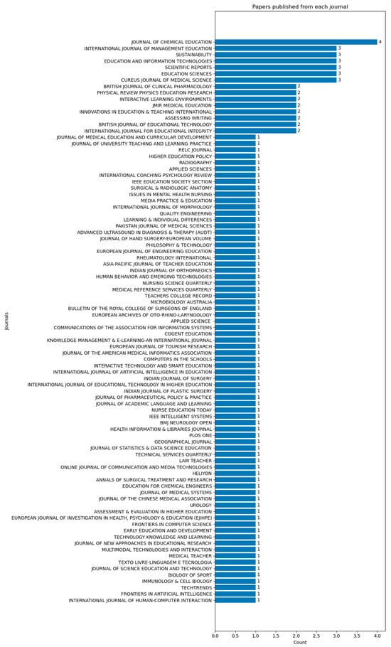 Figure 4 illustrates the distribution of published papers on ChatGPT across a spectrum of academic journals in 2023. The Journal of Chemical Education (n = 4) had the most publications, indicating a particular interest or focus on ChatGPT within the chemical education community. This was closely followed by other journals, including Cureus Journal of Medical Science, Sustainability, Education and Information Technologies, Scientific Reports, and International Journal of Management Education (n = 3), each contributing three papers to the discourse on ChatGPT. The diversity of journals—from medical sciences to sustainability and information technology—reflects ChatGPT’s interdisciplinary impact and the wide-ranging academic curiosity it has sparked. A single paper was found in numerous other journals, highlighting the expansive influence of this AI technology, which extends across various fields and specialties within the academic landscape.