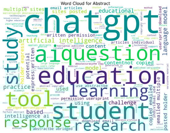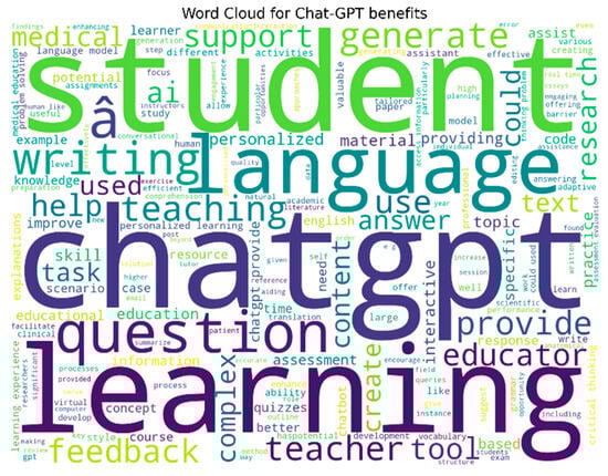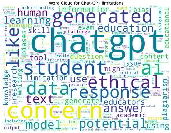 Additionally, we created word clouds for abstracts, ChatGPT benefits, and limitations (Figure 5, Figure 6, and Figure 7, respectively). Figure 5 presents the abstracts of papers related to ChatGPT, highlighting the central themes and concepts emerging from academic discussions. Dominant terms like “education”, “student”, “learning”, and “question” highlight the focus on the educational applications of ChatGPT and its role in student engagement and learning processes. The visibility of words like “study”, “research”, and “artificial intelligence” reflects the scholarly examination of AI tools in academic settings. Meanwhile, the presence of “tool” and “response” within the cloud suggests an interest in the functional aspects of ChatGPT, such as its responsiveness and utility as a supportive tool in educational practices. Together, these terms sketch a landscape in which ChatGPT’s influence on education can be scrutinized from multiple angles, emphasizing its integration into teaching methods, student interaction, and the broader implications of AI in learning environments.