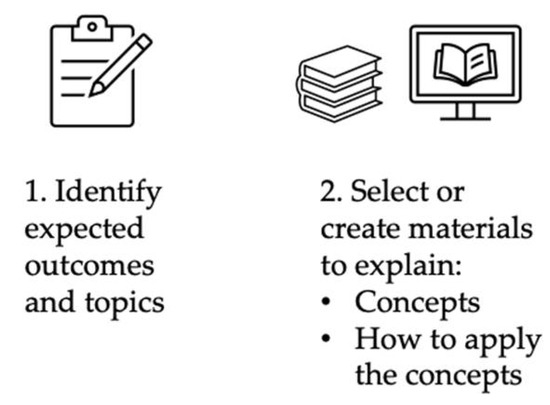 - Select or create materials to explain concepts and how to apply them. It is recommended to have different kinds of materials, such as videos or readings, to meet different students’ learning styles and preferences [15,44].Huesca et al. [22] also state that it is helpful to look for two types of materials: