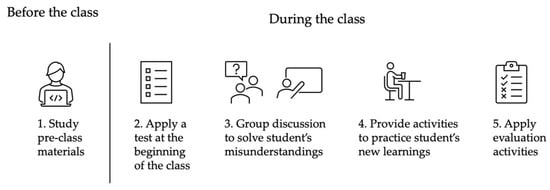 - Study pre-class materials. Before each class session, students must prepare themselves by exploring the contents and materials the professor gave to them. It is recommended that professors explain the importance of this first step to students at the beginning of the course and that students know that there will not be a lecture about the topic in the class sessions so they need to take notes and write questions that arise [8].