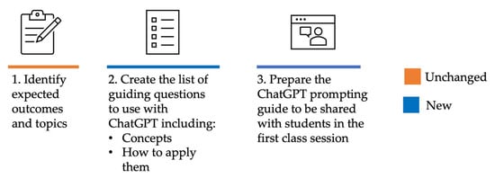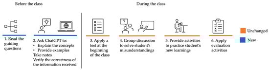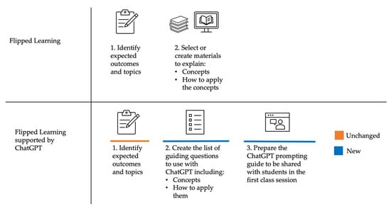 The preparation phase includes the following steps. Figure 3 marks those steps that are inherited from the traditional flipped learning strategy and those that are added to enhance the process with ChatGPT.