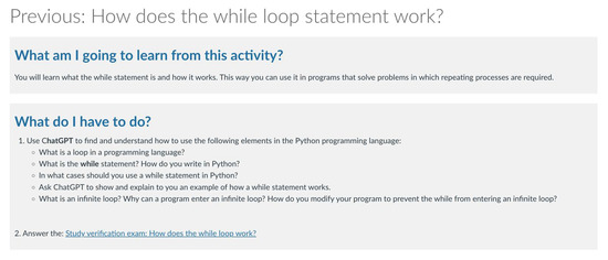 In Figure 4, there is an example of a pre-class activity shared with students in a basic programming course. In this description, a presentation of the expected outcomes and the list of guiding questions that students are expected to use when chatting with ChatGPT are included. As can be seen, there are questions about the concepts (e.g., What is a loop in a programming language?) and about the application of them (e.g., Ask ChatGPT to show and explain to you an example of how a while statement works.).