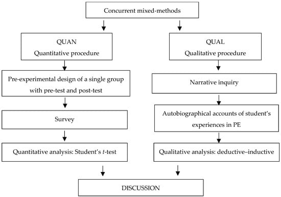 A concurrent mixed-methods study was conducted, involving the simultaneous collection of both quantitative and qualitative data [45]. The use of the mixed-methods approach entails a systematic set of research processes and includes the simultaneous collection of quantitative and qualitative data, followed by their integration and joint discussion to achieve a more comprehensive understanding of the studied phenomenon [46]. The selection of this method aligns with the formulated research objectives and allows for a more holistic response, enhancing the explanatory capacity of the results. Specifically, the combination of both methods will enable us to compare students’ perceptions of the content of the subject of physical education before and after completing the course. Additionally, it will enrich the significance of these results with students’ narratives about their experience with physical education throughout their school trajectory. The study was conducted within the framework of the Didactics of Physical Education course in the primary education degree program at the University of Santiago de Compostela (Galicia, Spain).