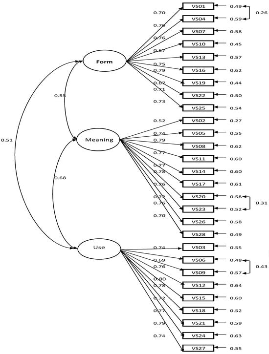 The factor loadings were all within the acceptable range, between 0.52 and 0.81 [49]. All standard errors were small and ranged from 0.27 to 0.62. However, modification indices (MI) suggested that the chi-square value would decrease greatly by correlating VS06 and VS09. This suggests that VS06 “I can add an English word into a sentence in the correct position” and VS09 “I can tell what other words or types of words can occur with an English word” are closely correlated. These two expressions were derived from the subscale “collocations” in Nation’s [1] word-knowledge taxonomy. If students believe they can tell what other words or types of words can link with a new English word, then they are also likely to believe that they can add an English word into a sentence in the correct position.