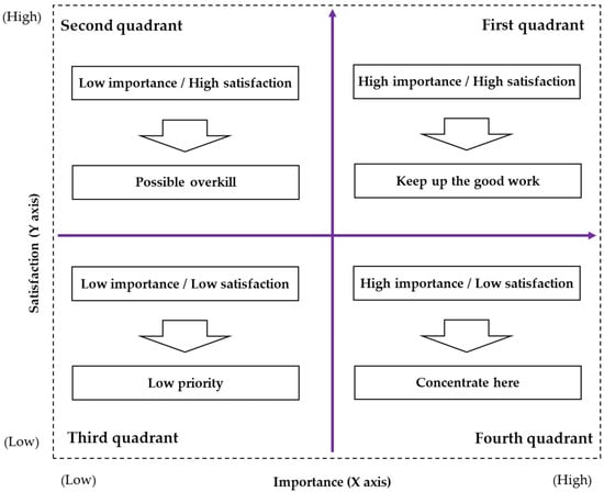 Customers’ perceptions of importance concerning products and services are quantified via the IPA’s two-dimensional factors, which include the X-axis (importance index) and the Y-axis (satisfaction index). These dimensions are instrumental in the allocation of the four quadrants, delineating the priorities for each attribute targeted for improvement. The study aims to establish the mean average of the X and Y axes to create a central point, subsequently generating the four quadrants as depicted in Figure 1.