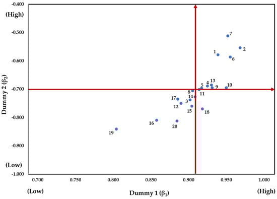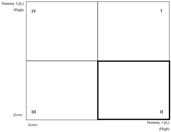 Step four: In terms of the mean average of β1 (dummy 1)—(X axis) and β2 (dummy 2)—(Y axis) introduced by Madzík [45], the matrix coefficient of English instruction quality satisfaction and the central shaft are formed accordingly [47].