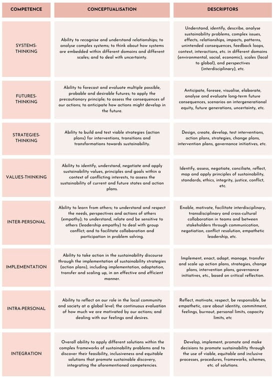 Key competencies in sustainability are a fundamental reference point for developing this ambitious profile of knowledge and skills among students so that they can act as “agents of change” [21]. Nonetheless, it is worth noting that the concept of competence in the field of education initially emerged from an economic perspective, which may be controversial when used in the framework of education for sustainability. Assuming this, this paper builds on [21]’s view of competences. These authors defined competence as “a functionally linked complex of knowledge, skills, and attitudes that enable successful task performance and problem solving with respect to real-world sustainability problems, challenges, and opportunities” [21] (p. 204).