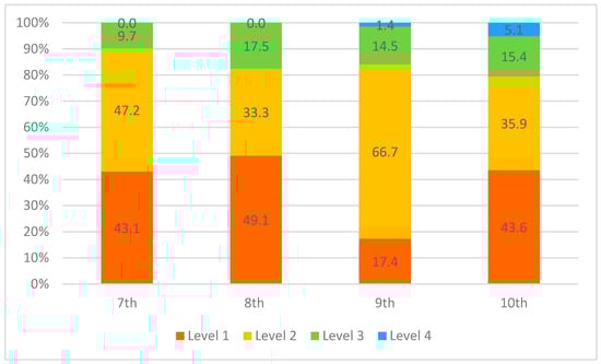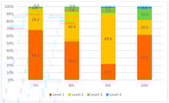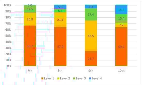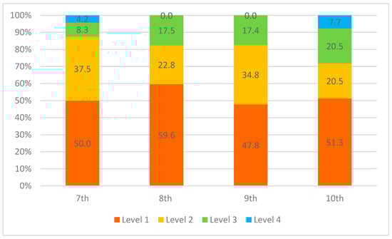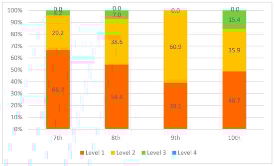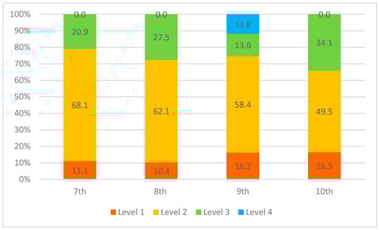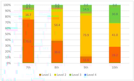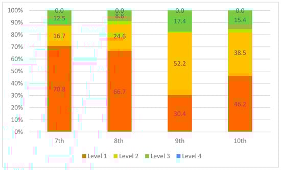 When considering the different grades, we find a clear dominance of level 1 in the 7th grade, as well as of level 2 in the 8th and 9th grades (Figure 8). In the 10th grade, although level 2 dominates, there is an increase in the frequency of level 3. These differences are significant (Z = 17.102; df = 3; p < 0.001). The subsequent analysis indicates that the 7th grade shows a different trend to the others (1st–2nd grades: Z = −2.051; p < 0.040; 1st–3rd: Z = −3.758; p < 0.001; 1st–4th: Z = −2.185; p < 0.029), with a lower level of acquisition of this competence.