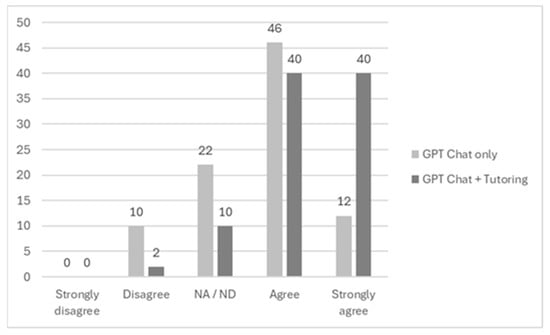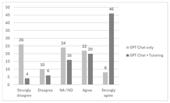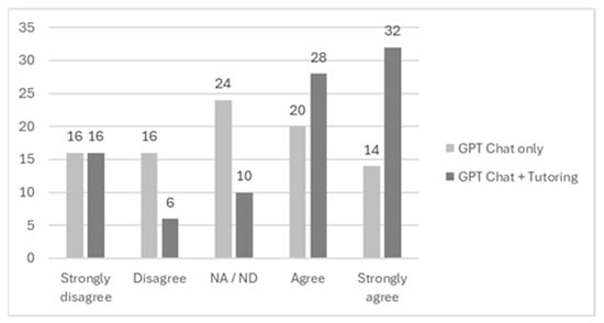 Finally, also an interesting result is that a similar response was obtained from both groups (60% and 62%) on the question of whether ChatGPT or ChatGPT + tutoring would be sufficient to pass a final exam in a subject (see