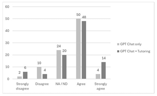 On the other hand, of the students who solely utilised ChatGPT in the activity, 64% stated that they considered that they had obtained enough content to master the proposed subject matter, while the figure for those who complemented the use of ChatGPT with personal tutoring was 87% (see