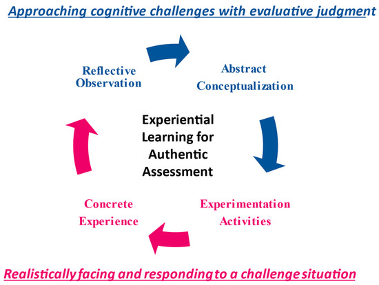 Hence, experiential learning labs here point to those places, venues, locations, or environments where reflective and practical learning activities take place regarding real-life challenging situations, inside and/or outside universities and classrooms, to achieve intended learning outcomes individually and collectively. Experiential learning labs emerge in the iterative constitution process of reflective thinking involving reflection and conceptualisation, and practical activities comprising perception and experimentation [52]. Experiential learning for authentic assessment comprises realistically facing and responding to a situation involving approaching cognitive challenges with evaluative judgment, as presented in Figure 1. Accordingly, in experiential learning labs, authentic assessment goes beyond assessment methods to consider the integration of authentic assessment principles into experiential learning activities, developing authentic experiential learning.