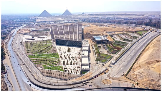 It is located in the Giza Plateau, near the three pyramids, which was inscribed as a World Heritage Site in 1979. Its unique location lies at the intersection between the modernity of Cairo and the fascinating heritage site of the pyramids, making the GEM a remarkable destination away from the bustling downtown Cairo, where the Egyptian Museum of Cairo is situated. Due to its proximity and monumental size, it has earned the nickname of the “fourth pyramid” [81] (Figure 1).