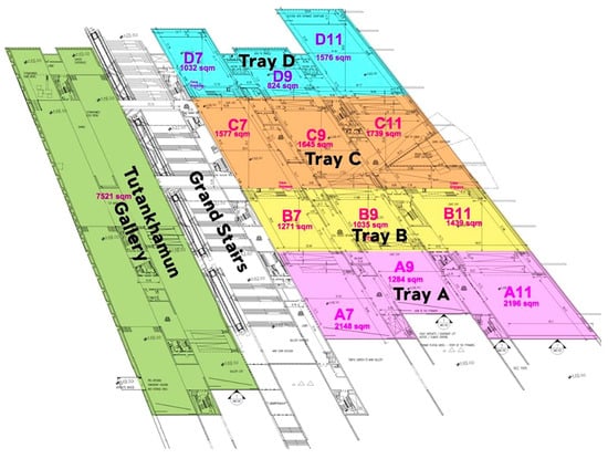 The GEM project was completed in several phases, from enabling the site in 2005, the construction of a conservation center and an energy center between 2006 and 2010, to the final phase of the museum building, which began in 2012 and is expected to be fully completed and opened by the end of 2024 [69,86]. The total land area of the project is 470,974 square meters, while the museum building covers an area of 92,623 square meters [87]. The Egyptian government has provided funding for the GEM, along with some soft loans from The Japan International Cooperation Agency (JICA), to support the third phase of the museum building’s construction [86].