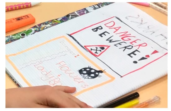 Miss Olivia introduced visual design and persuasive language elements using a collection of danger signs and scaffolded the students as they collaborated to investigate the interplay between images and wordings. Using a danger sign from a local beach as a model, students were introduced to intermodal coupling, where multiple modes such as words, colours and images come together [32] to create specific meanings.