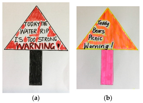 Students were then tasked with creating their own warning signs for something dangerous at the beach. Creating multimodal texts can deepen students’ understanding of the interrelationships among the various modes [4,33]. Next, in a surprising pedagogical move, students were asked to design a danger sign for something that is not typically considered dangerous. This task challenged students to consider their choices about the linguistic and visual elements. The opportunity to create both conventional and unconventional texts allowed students to experience the effect of their different choices.