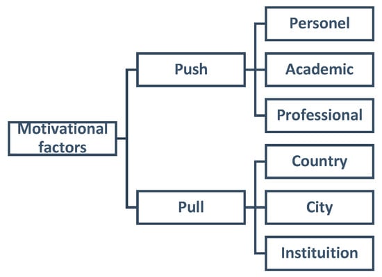 16]. This model enables analysing the push–pull factors that are most important to students and the respective category. The pull factors can be grouped into the three main aspects that influence attractiveness: the destination country, the hosting city, and the academic institution [