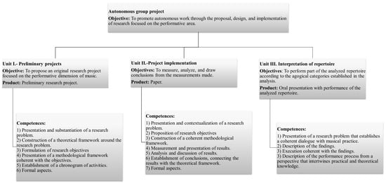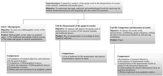 The intervention was carried out in an elective course at a private university located in Santiago de Chile. This university has a conservatory that offers performance programs in various instruments and composition, as well as a music pedagogy program. It was offered as an open subject for all students at the university. It was planned by the professor, who fulfilled the role of teacher–researcher, to cover two academic cycles. The learning objectives, activities, and methodology detailed below for each cycle were proposed by the professor and are aligned with the general competencies defined by the university for all its optative courses: (1) use and interpretation of reliable sources of information; (2) application of critical reasoning; (3) oral and written communication; and (4) collaborative work.