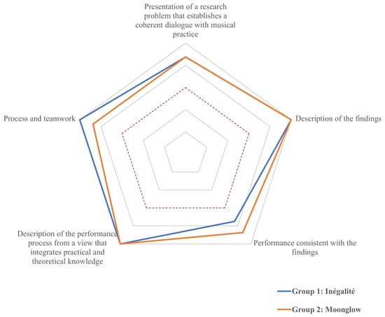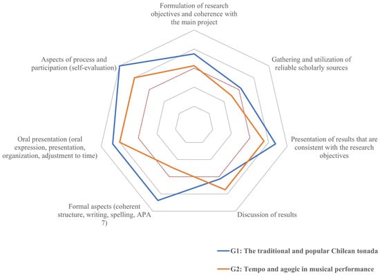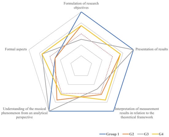 In general, the learning objectives proposed for the unit were met, although a deficiency was observed in the establishment of a work schedule in one of the groups. As the second activity of the cycle, they had to take the data corresponding to each research project, which implied taking measurements of the agogic of the proposed repertoire, and interpreting and discussing the results, to present them in writing in the Introduction–Method–Results-and-Discussion format (IMRaD) format. The results of this activity are presented in Figure 8.