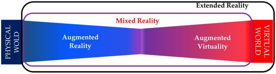 Extended reality (XR) is an “umbrella” term that includes the combination of all virtual and real environments, where the term “X” changes depending on the technology we are referring to [23] (Figure 1).
