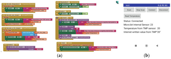 MIT App Inventor is an online programming platform that can be used effectively as a tool to develop mobile device software and educational applications [76,77,78]. The MIT App Inventor user interface includes two main editors: the drawing editor and the block editor (Figure 4). To help with app development and testing, the App Inventor provides a mobile app called the App Inventor Companion (or simply “the Companion”) that developers can use to test and customize the behavior of their applications in real time [79].