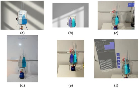 In the last part of the layout, there is the Mixed Reality application, which was developed in the Unity 3D environment. The design of the application was carried out in C# language, and the research team checked its scientific validity. With the help of Microsoft HoloLens 2, the application displays the digital holograms in the physical environment of the users. These correspond to the real ones used in the real experimental setup and parameterize the visual objects based on the temperature value of the real sensor, which is taken online in real time with an API Request (Figure 7).
