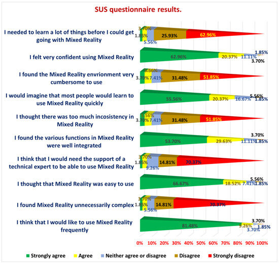In order to assess the ease of use of the Mixed Reality environment, the System Usability Scale (SUS) questionnaire was administered to the students. The SUS is an effective tool for assessing the user experience of a new system and investigates three main aspects: the effectiveness, the efficiency and the satisfaction of using this technology [86]. The questionnaire consists of questions answered on a five-point Likert Scale, where value one corresponds to “Fully disagree” and value five to “Fully agree”. The Cronbach coefficient of the questionnaire is 0.794.