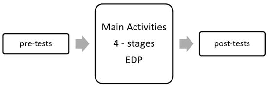 The research design consisted of a pre-test, four (4) main stages that followed the Engineering Design Process (EDP) for Early Childhood Education [], and a post-test (Figure 1). The main activities that followed the 4 stages of the EDP were: (1) Problem, (2) Inquiry, (3) Designing and Testing, and (4) Conclusions and Presentation. The pre-tests were conducted a week before the main activities while the post-tests were conducted a week after the completion of the main activities.
