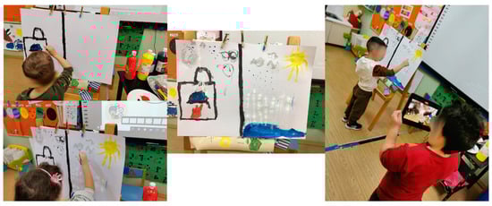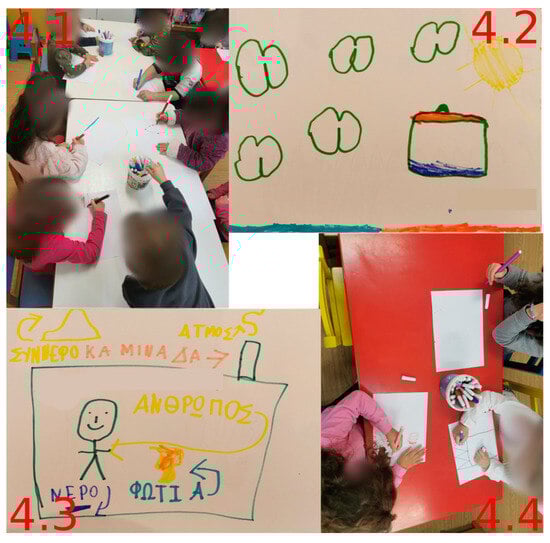 Qualitative data were collected through (a) recordings of both the researcher’s narration and children’s dialogues during the four stages of activities (duration: 1 h and 30 min), (b) children’s drawings after each stage of activities (95 drawings in total), (c) children’s non-verbal behavior protocols, and (d) analysis of the video footage. Analysis of the narrative and dialogue was based on the transcripts, with simultaneous documentation of the video footage, drawings, and protocols. The texts were divided into episodes based on themes related to condensation and precipitation [,,]. The analysis of the episodes was aimed at identifying the critical points at which the formation in children’s thinking of mental representations compatible with knowledge learned at school takes place. These critical points were actually the key elements of the precursor model. From this qualitative analysis, the creation of clouds and the processes of evaporation, condensation, and precipitation, as well as precipitation in everyday conditions, emerged as central themes, whose main dimensions will be presented in the following section.