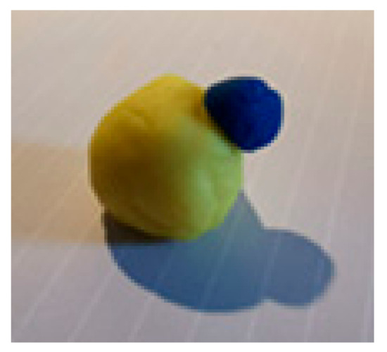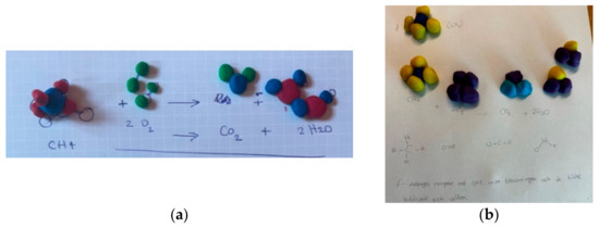 The use of modelling clay also placed another difficulty on the chemical equations themselves. The student needed to be creative in their constructions in order to distinguish between different types of atoms (Table 2) allowing them to show the redistribution of atoms in the chemical reaction (Figure 3a). A large proportion of students (85%) used colours or other markers to distinguish the different types of atoms (Table 2). Among the remaining 15%, it was not possible to follow the redistribution of the different types of atoms. Either the same colour was used for two different types of atoms, or the same colour was not used for the same type of atom in the reactants and products. For examples, see Figure 6a,b.
