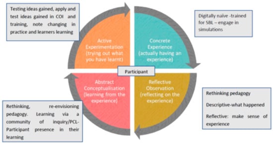 The ELT cycle comprises four stages. There are two stages for understanding experience, the concrete experience and abstract conceptualization, and two for transforming experience, namely, reflective observation and active experimentation. In the ELT cycle, concrete experience is the platform for all observation and reflection. In this study, the experience relates to science and technology teachers’ experiences of being trained to use SBL via hands-on practical tasks. Reflections on their concrete experience with SBL led to rethinking, reimagining, and learning from practice via a professional learning community. These new abstract conceptualizations resulted in active experimentation. Each stage of the ELT cycle is used as a lens to analyze participants’ experiences of learning about SBL.