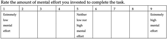 The Cognitive Load Subjective Rating Scale, developed by Paas in 1992 [30], is a nine-point scale assessing participants’ perceived mental effort, validated for measuring cognitive load. Similarly, the Task Difficulty Subjective Rating Scale, also a nine-point scale, evaluates participants’ perceived task difficulty [31]. Figure 1 and Figure 2 below present both scales: