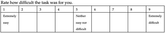 - Reported perceived task difficulty measured by the Task Difficulty Subjective Rating Scale [31,32].