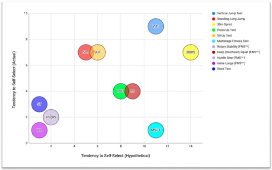 It is important to note that students were instructed to select three of ten fitness tests. Of the tests selected, student selections differed from their hypothetical selections. A reason why this is the case could be attributed to aligning required performance competencies with areas of higher relative skill. Kahneman and Tversky’s [24] prospect theory examines how individuals make decisions under conditions of risk and uncertainty, and it considers how people evaluate potential gains and losses. In the context of a student’s decision making, relative skill can influence their perception of potential gains and losses associated with different activities in a public domain, for example, completing the MSFT in a gymnasium as a PE class. The presumed risk of a negative outcome or embarrassment throughout test performance may influence the selections made. The student’s assessment of their own skills and abilities relative to other options may impact their decision-making process as well. According to prospect theory, individuals tend to exhibit risk aversion when facing potential gains and risk-seeking behavior when facing potential losses. Applying prospect theory to the students’ decision, if they perceive themselves as having a higher level of skill or expertise in a particular activity compared to other possible options, they may be more inclined to select that activity. The potential gain, such as success, recognition, or positive outcomes, associated with their perceived relative skill may outweigh the potential loss, such as failure, embarrassment, or negative outcomes, in their decision-making calculus. On the other hand, if the students perceive themselves as having lower relative skill compared to other possible options, they may be more risk-averse and less likely to choose those activities. They may anticipate a higher potential loss, such as failure, negative evaluation, or unfavorable outcomes, compared to the potential gain, leading them to opt for activities where they perceive their relative skill to be higher.