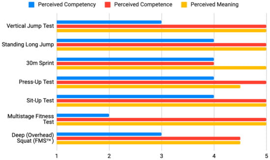 To assess students’ competence in accordance with self-determination theory, data were gathered through two distinct approaches: prompting for perceived competency and competence and prompting for meaning. Students responded to prompts related to perceived competency, stating their belief in their proficiency with the statement: “When it comes to performing this activity, I think I am pretty good.” Additionally, they provided responses regarding perceived competence, indicating their confidence in their ability to perform well after practice, with the statement: “If I worked at this activity for a while, I feel that I can do it pretty well”. Both prompts were responded to using a five-point Likert scale, ascending from strongly disagree to strongly agree. The results of these prompts, capturing perceived competency and competence, are presented in Figure 2. Furthermore, following the selection, performance, and recording of fitness test results, students were asked to rate their perception of the meaningfulness of each activity in evaluating their fitness, using a five-point Likert scale. The responses to this prompt are also displayed in Figure 2. It is important to note that students included in the data represented in Figure 2 actively chose to perform and record their scores in specific tests.