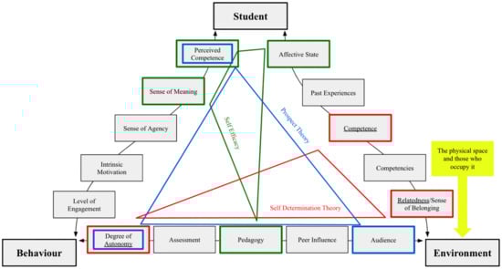 The concepts and theories explored in the research are depicted in Figure 3, which illustrates the complex range of relationships influencing behavior. This conceptual diagram provides insights into addressing the research question of how competence can be utilized to support autonomy in high school physical education electives. It highlights the multitude of factors that influence competence, perceived competence, and autonomy. The student, environment, and behavior must all be taken into account when aiming to enhance competence and promote interaction with the physical environment. It is important to note that while competence is often assessed in educational environments, the manner in which these assessments are carried out can potentially undermine autonomy and agency. When given the chance to choose their own fitness tests, this research has shown that students may not select the most appropriate tool to assess their fitness accurately. The connection between actual and hypothetical selections of fitness tests highlights this finding.