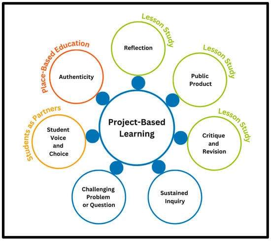 This study uses the tenets of project-based learning to engage a group of undergraduate and graduate students in a student-led lesson study. This study melds the world of project-based learning with lesson study [,,,,,] and serves as a novel adaptation of the two concepts where students and instructors act as partners in curriculum development []. We frame the entire study as a project-based learning experience that leverages and infuses (1) place-based education, (2) lesson study, and (3) students as partners in curriculum development (see Figure 1).