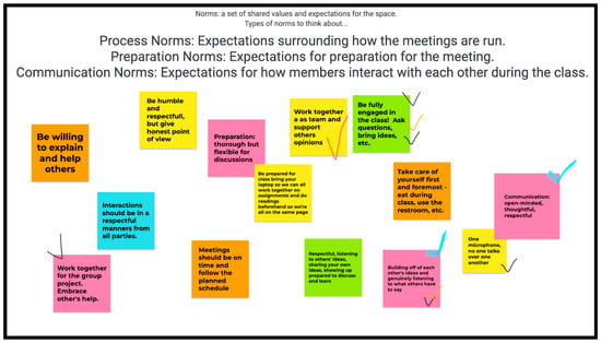 A key component of the course that supported the lesson architects was facilitating open and effective communication throughout the course. Students rarely engage in project-based learning in higher education STEM disciplines [], which is why course design [] should emphasize the importance of fostering an environment that is inclusive to students from different backgrounds and conducive to project-based learning. By having the lesson architects create their own classroom norms, they were able to express their expectations of their peers and their instructors. These expectations could differ between the cultures of the United States and Norway or even regionally across the United States. However, having the lesson architects relay their unspoken expectations to their peers allowed everyone to have a shared understanding of the expectations within the course. The anonymity allowed the lesson architects to be honest with their expectations without having the initial discomfort of speaking to a group of people they just met.
