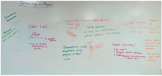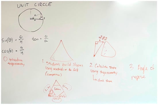 Multiple scaffolded activities took place throughout the semester to assist in broadening the lesson architects’ knowledge of interdisciplinary STEM, place-based education, and lesson design. Two scaffolded activities involved the lesson architects reading articles on interdisciplinary STEM education and place-based education outside of class. During class, the lesson architects derived definitions from the articles and their own experiences to accurately define interdisciplinary STEM education and place-based education. When defining interdisciplinary STEM education, the lesson architects were tasked with combining two random STEM disciplines into an interdisciplinary lesson. Figure 5 shows one group of lesson architects’ work combining physics/technology, and Figure 6 shows the other group of lesson architects’ work combining precalculus/geology into two interdisciplinary lessons.