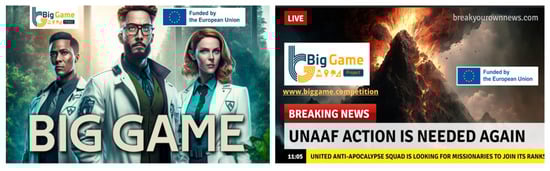 - Fiadotau, M.; Tramonti, M.; Brander, H.; Callaghan, P. BIG GAME: Balancing player preferences and design considerations in a serious game about environmental issues. In Proceedings of the International Conference on Games and Learning Alliance, Tampere, Finland, 30 November–2 December 2022; pp. 329–334. [Google Scholar]