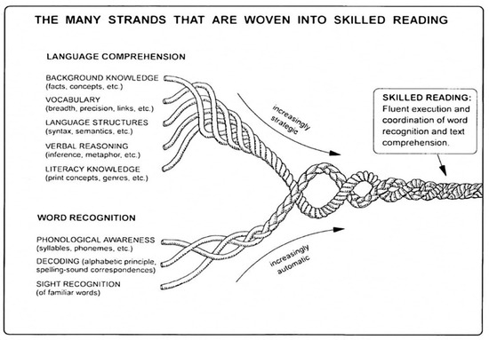 Scarborough’s Reading Rope [10] has become a common foundational structure in both curricula revision and resources utilized in more current reading instruction. In addition, it has become the impetus for state-mandated professional development regarding reading instruction, including nationwide reading academies and science of reading trainings.